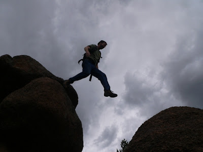 This is my darling daughter (above), getting ready for her rapelling trip down a 30 ft. cliff in Vedauwoo, Wyoming. She gets this desire from this guy (my adventurous husband):