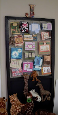 Here is the picture of my craft show find. It isn't really a door, but made to look like one. I will probably end up painting it someday -- I would prefer a lighter color over the really dark brown. I put up some cards quickly so you could see how it looks. And added some of my giraffe buddies!