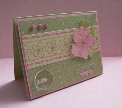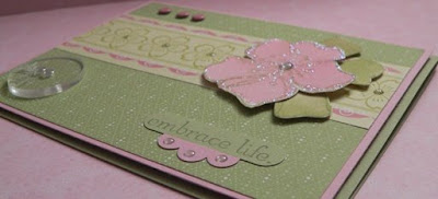 I stamped the flower from Embrace Life (Stampin' Up!) with Certainly Celery and then watercolored it with Pretty in Pink. I added Stickles to the flower edges and middle. The leaves are made from the flower - again stamped in Certainly Celery, but then watercolored with the same color. The middle strip is from a lovely piece of DP I got from a friend - but I don't know who makes it.