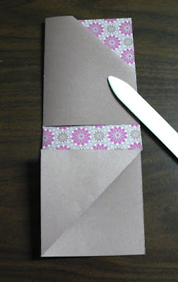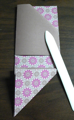 Secondly, I must apologize for the quality of the pictures. My downstairs has huge overhead lighting like an office building and it doesn't take very good pictures. So this beautiful paper I am using looks very different and washed out and the colors are not true. But until I can redo this, I wanted you to at least see how to make a Double Pocket card so that you can make your own!
