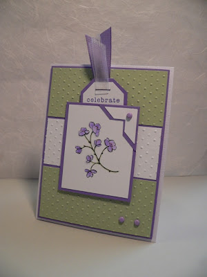 Accessories: Cuttlebug Swiss Dots EF, white organdy and lilac grosgrain ribbon, lilac brads (American Craft Co.), photo corner punch, aqua brush, tag punch, purple staple