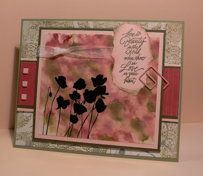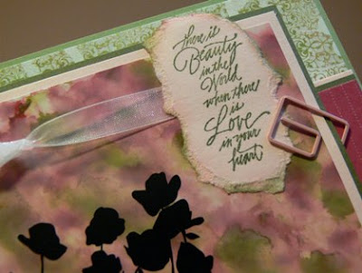 I have also recently re-discovered how much fun Magic Mesh is to use, so I added that as an embellishment and tied some Fancy Fibers over the top layer of the card. The background papers from Provo Craft brought out both colors in my main image. A little torn edge here and there, and some sponged clouds in the background - and it was done! Don't think it was a fast process! My long-time readers know I make cards very slowly. I think I enjoy the process more than the finished product sometimes!