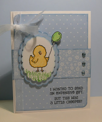 Our theme for the House Mouse & Friends blog challenge was "New." The challenges are new, the blog is new, so our theme was new! I made this card (5 inches square) using a Happy Hopper for my main image. I stamped it in Basic Gray ink, and then watercolored using reinkers and an aqua brush. I outlined the whole image with Copic C-1.The sentiment is stamped in Chocolate Chip ink. The little brad buttons are a cute addition for a baby card, although I do wish I had spaced them father apart. The large jumbo eyelet says "adore."