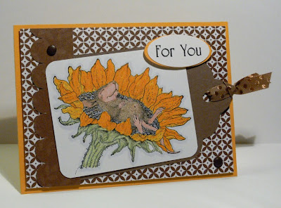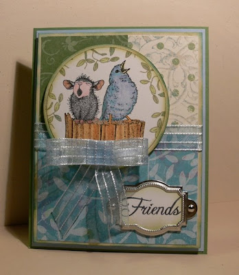 Today's challenge over at House Mouse & Friends was to make a card using one of our House Mouse images and have the total expense (minus intial ink cost and the cost of the stamp, or other non-consumable items - like the scallop punch) be under $2.00. I "squeaked" in (little pun there....) just under the wire at $1.85. We had to just estimate the cost of cardstock, trims and embellishments and that is what I came up with!