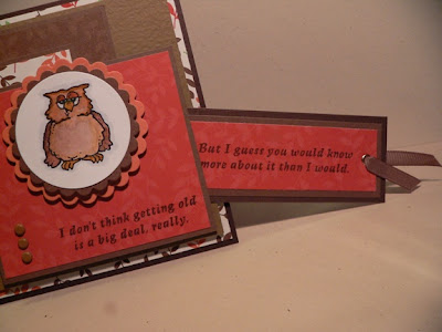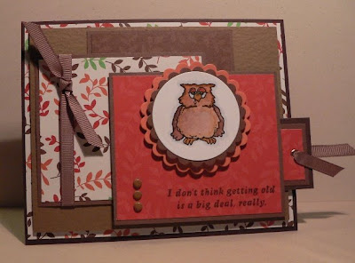 I made this card for today's SCS Sketch Challenge #195. I used my cute Owl and double sentiment set from Hambo Stamps and made a pocket for a tag in my card. This owl is old enough to know better than to be so sassy!