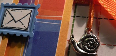 Accessories: embroidery thread by Making Memories, postage stamp brad, colored brads by The Paper Studio, orange stitched grosgrain, snail charm by Watch Us