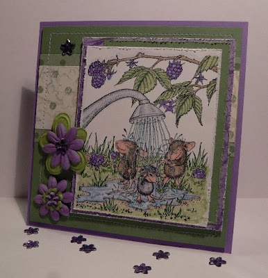 Over at the House Mouse & Friends blog, you can see all the Design Team members' cards. This week we were to use stitching of some kind on our card. I keep my sewing machine out all the time, so I just sewed a square border around the Wild Wasabi layer. These little mousies are having a fun time in their shower!