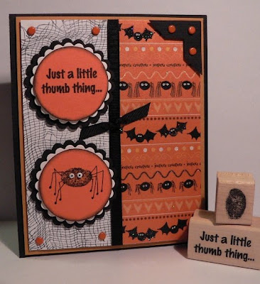 I used my Heidi Grace paper again, and carried the spider idea over into the thumbprint stamp. His eyes are tiny white brads (CTMH) on which I drew little black pupils with a Sharpie marker. This was a fun challenge, and I will have a few more projects with these two stamps later this week!