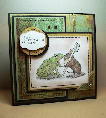 The Featured Stamper Challenge requires that at least two things are changed on the card of the chosen stamper. You can see the card of Dawn's that I chose to case ("copy and steal everything") HERE. I kept her quilt idea and layout, and changed the stamp images, as well as the background paper and ribbon placement. I also added some sewing with my Janome!