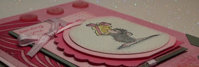 I don't normally lean toward vintage style, so this was fun! The card on the left opens with the scallop piece and has a little design inside that says "Party Time". We got sooooo much fun stuff at this class. Paper, stickers, ribbons, glimmer mist....LOTS of stuff to bring home and use on dozens of other projects!