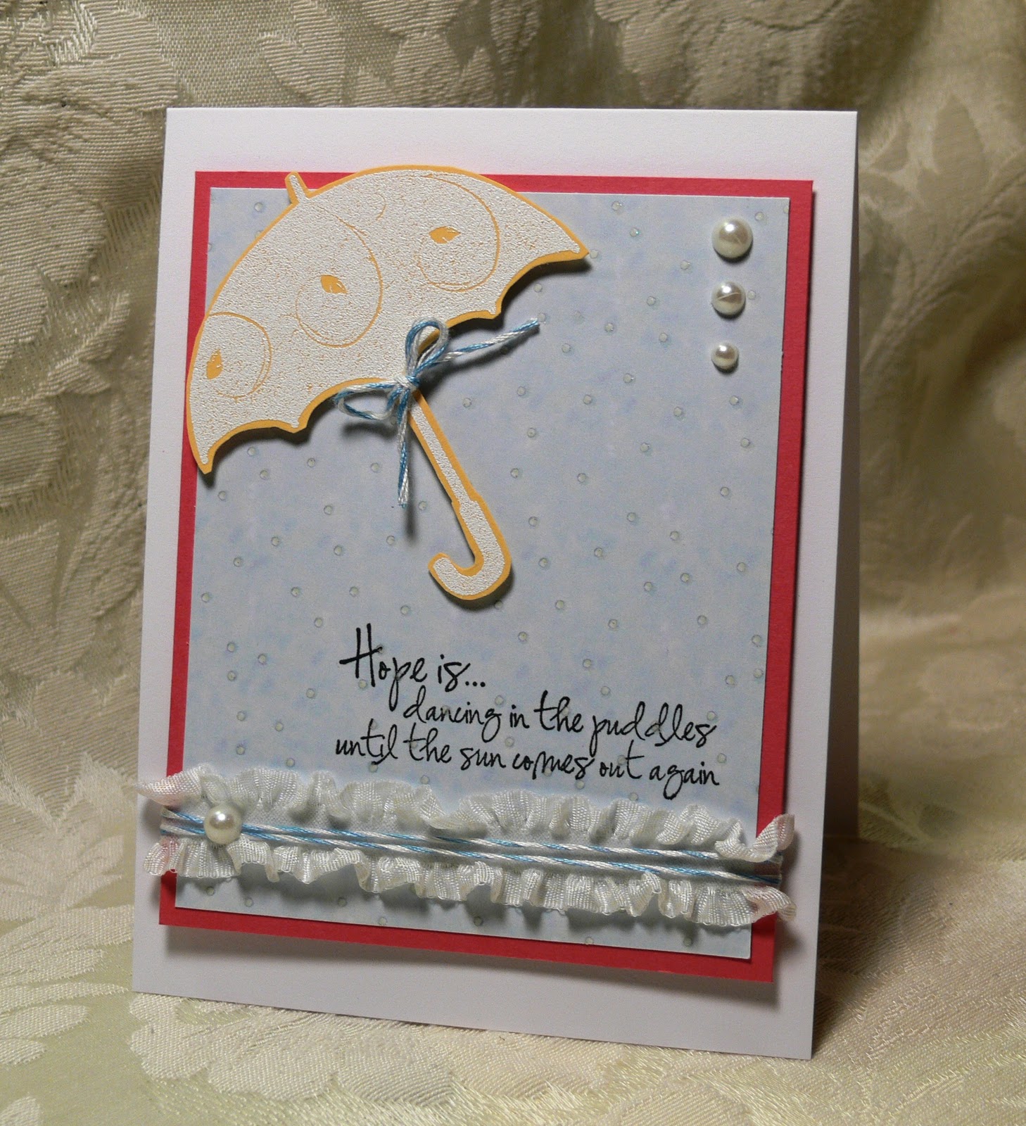 I made two simple projects today. I am trying for fewer layers and less fuss in my projects this week. My card is made with Spring Swirl stamp set. I embossed the umbrella with White Detail Embossing Powder. The sentiment is stamped with Memento Tuxedo Black ink. My tag is also using a sentiment from Spring Swirl. I embossed it with Firefly Embossing Powder. I seem to have different ribbon than everyone else on the hop, but you can find what I used here and here. I added some Oyster Baker's Twine to the card.