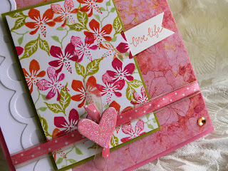 I sugared up some of the flowers with Bubble Gum Glitter, and also added that to the chipboard heart. Click on either photo for a close-up view!
