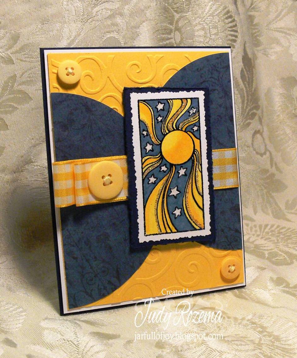 I stamped the image in Canary VersaColor, then embossed it with Dark Night Embossing Powder and colored in with Copics. I added some Celestial Glitter and Crystal Ice Glitter for a sparkly touch. The ribbon is 7/8" Yellow Gingham from Really Reasonable Ribbon. A little Cuttlebug Swirl Embossing Folder, some circles, a few buttons, deckle scissors, and a distressing tool, and it was done!