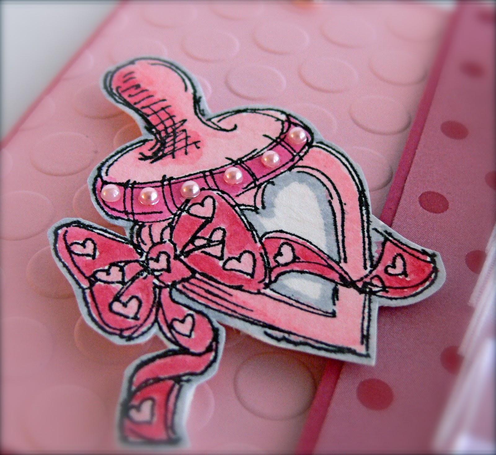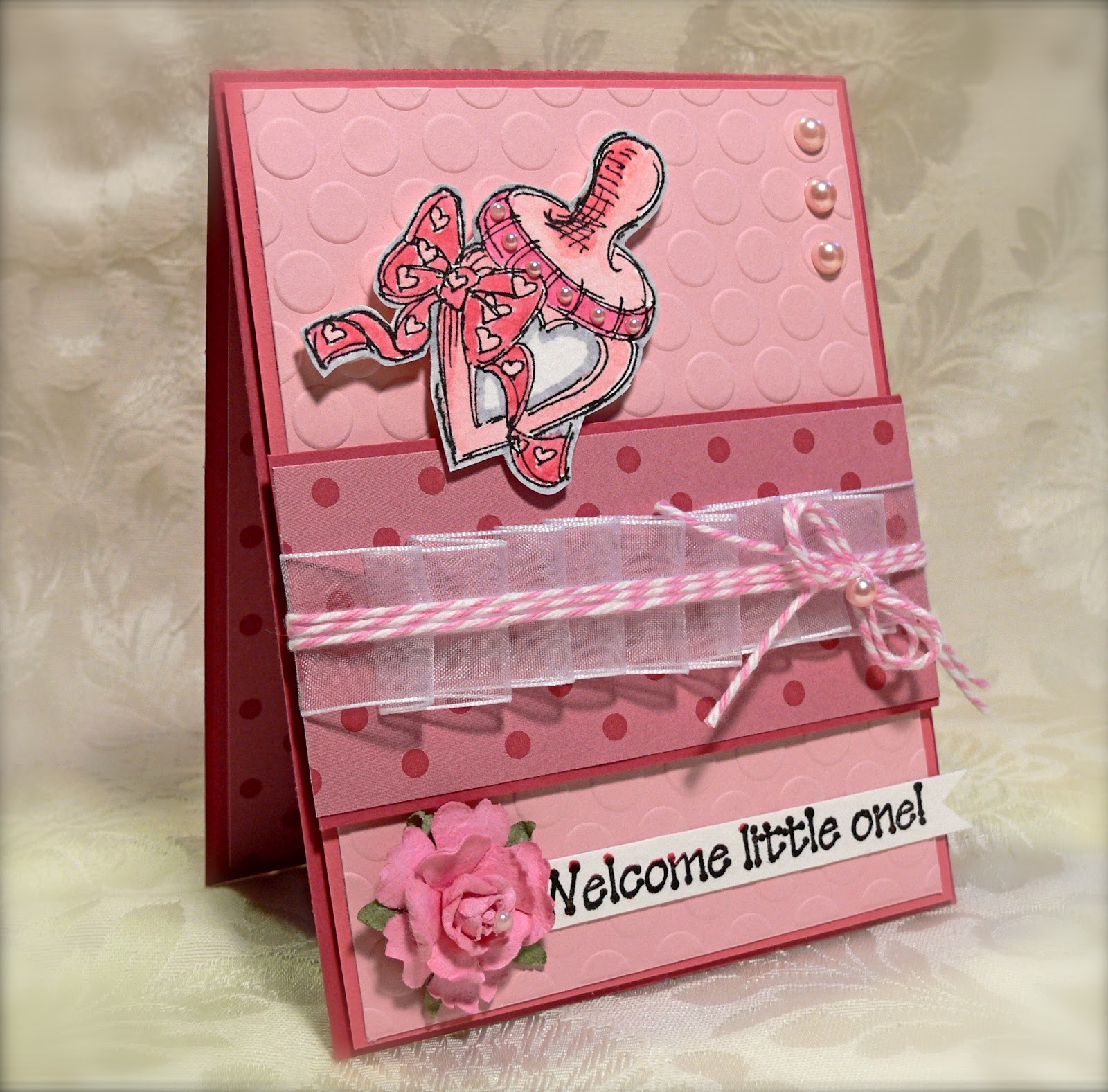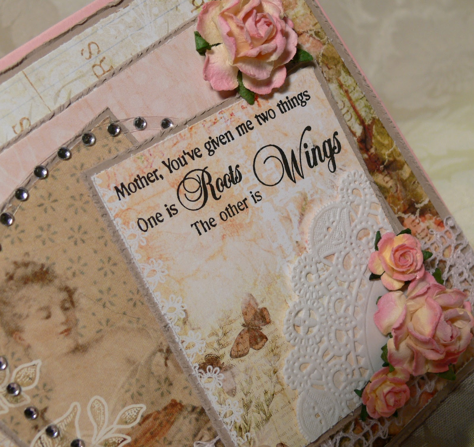 | Accessories: doily, corner rounder, distressing tool, paper roses (Wild Orchid), pink crochet lace (Really Reasonable Ribbon), gem circle, Chino pearls (Kaiser), seam binding (French Market), button (Basic Grey) twine (PTI)
