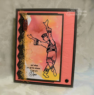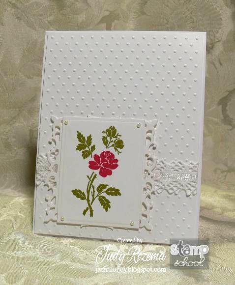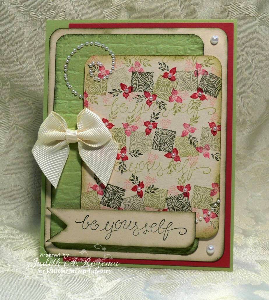 I used two images from Rubbernecker Stamps for my technique, and did one inked stamp (Believe Collage) and one uninked stamp (Paint Splattered Screen). The result is a more subtle look than if both stamps were inked. If you look closely you can see the screen design in the letters and flowers.