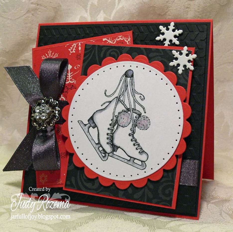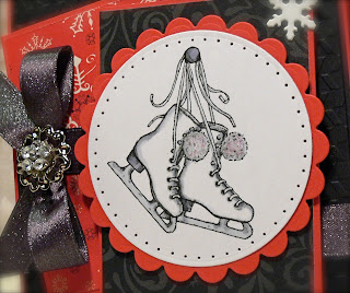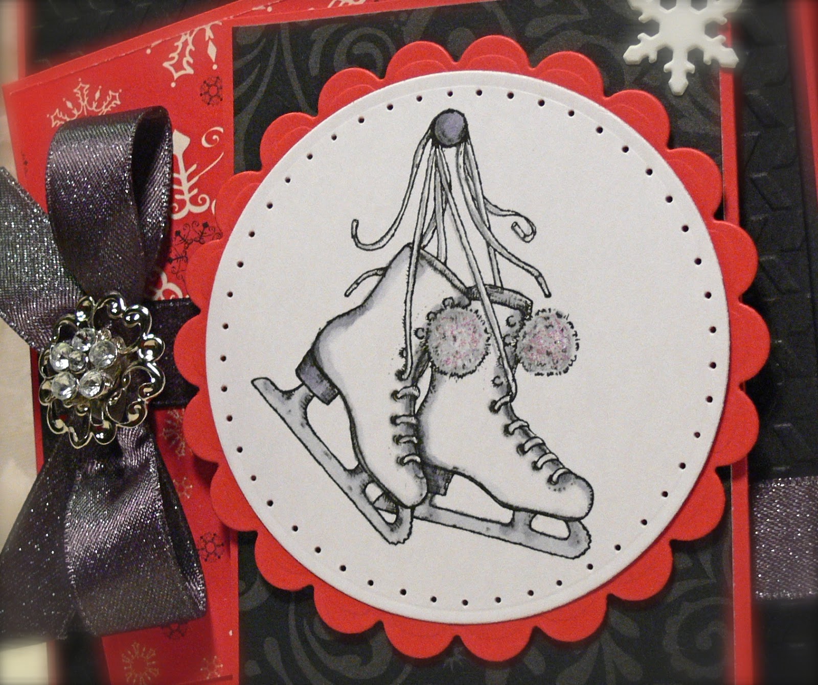 ribbon club. My image is by Flourishes from Snow Day, available at i {heart} papers. I stamped on X-Press Copic Blending cardstock using Memento Tuxedo Black ink, and then colored with Copic markers C1, C3, C5 and a Silver Prismacolor pencil. I added a little sparkle to the skates' pom poms with Crystal Stickles.