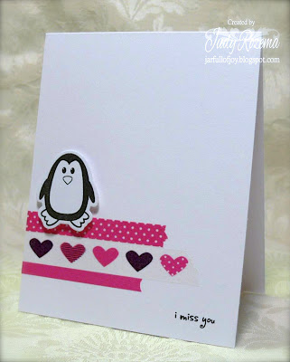 I used three different tape designs and just left the torn edge on the side. Then I stamped my sentiment from morepenguinstolove (TSOL) in Stephanie's Licorice ink. On a separate piece of white cardstock, I stamped the little penguin in Licorice and then cut him out using the small penguin die.