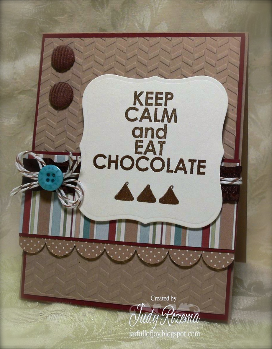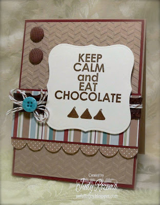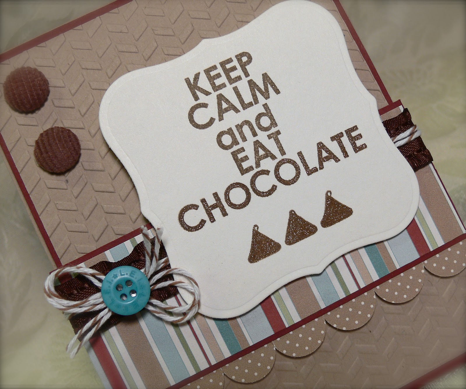My card is made with Technique Tuesday's Eat Chocolate stamp set. I stamped with Memento Rich Cocoa ink, and then added a little sparkle with my Chocolate Spica Glitter pen to the candy and the word "CHOCOLATE." I cut it out using my Spellbinders Label One dies. Click on the photo below to see a close-up of the sparkle!