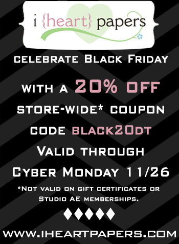 Celebrate Black Friday at i {heart} papers with a 20% store-wide coupon (excluding gift certificates and Studio AE memberships) using code: black20dt through Cyber Monday 11/26. And of course, always free US shipping with your $60 order! Happy Holidays from all of us at IHP!