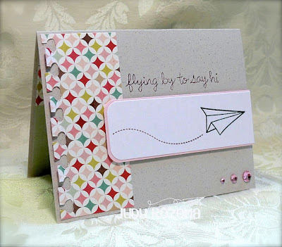 My designer paper is from Echo Park's This & That Graceful Collection. I stamped my paper airplane using Memento Tuxedo Black and the trail and sentiment in Memento Elderberry ink. Click on the photo for a close-up!
