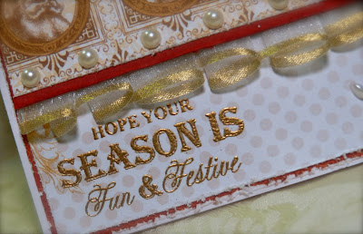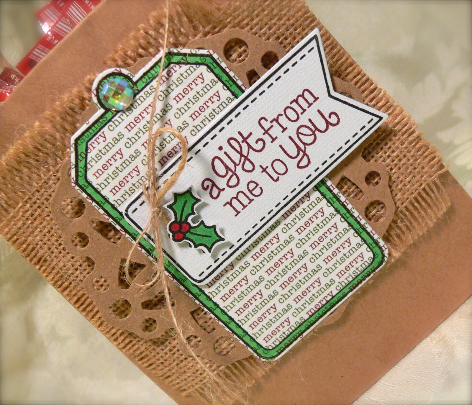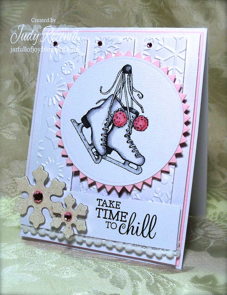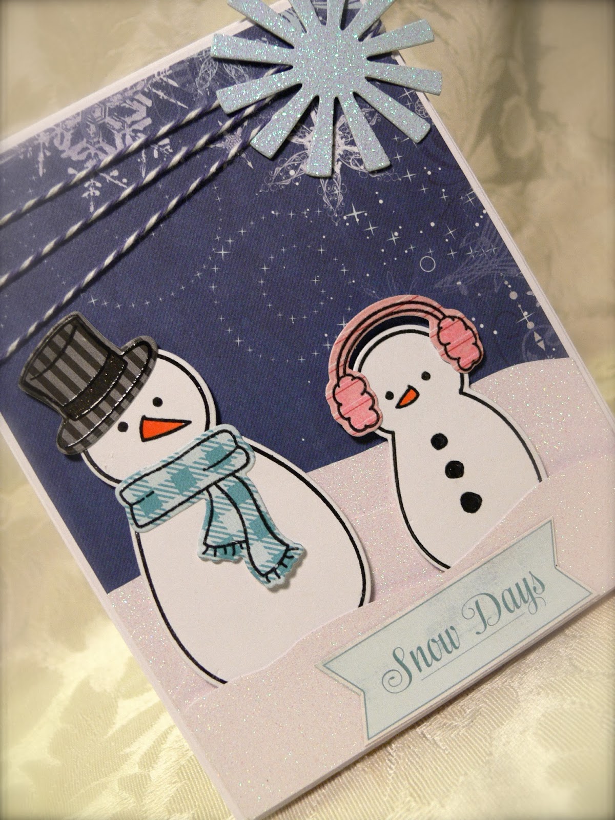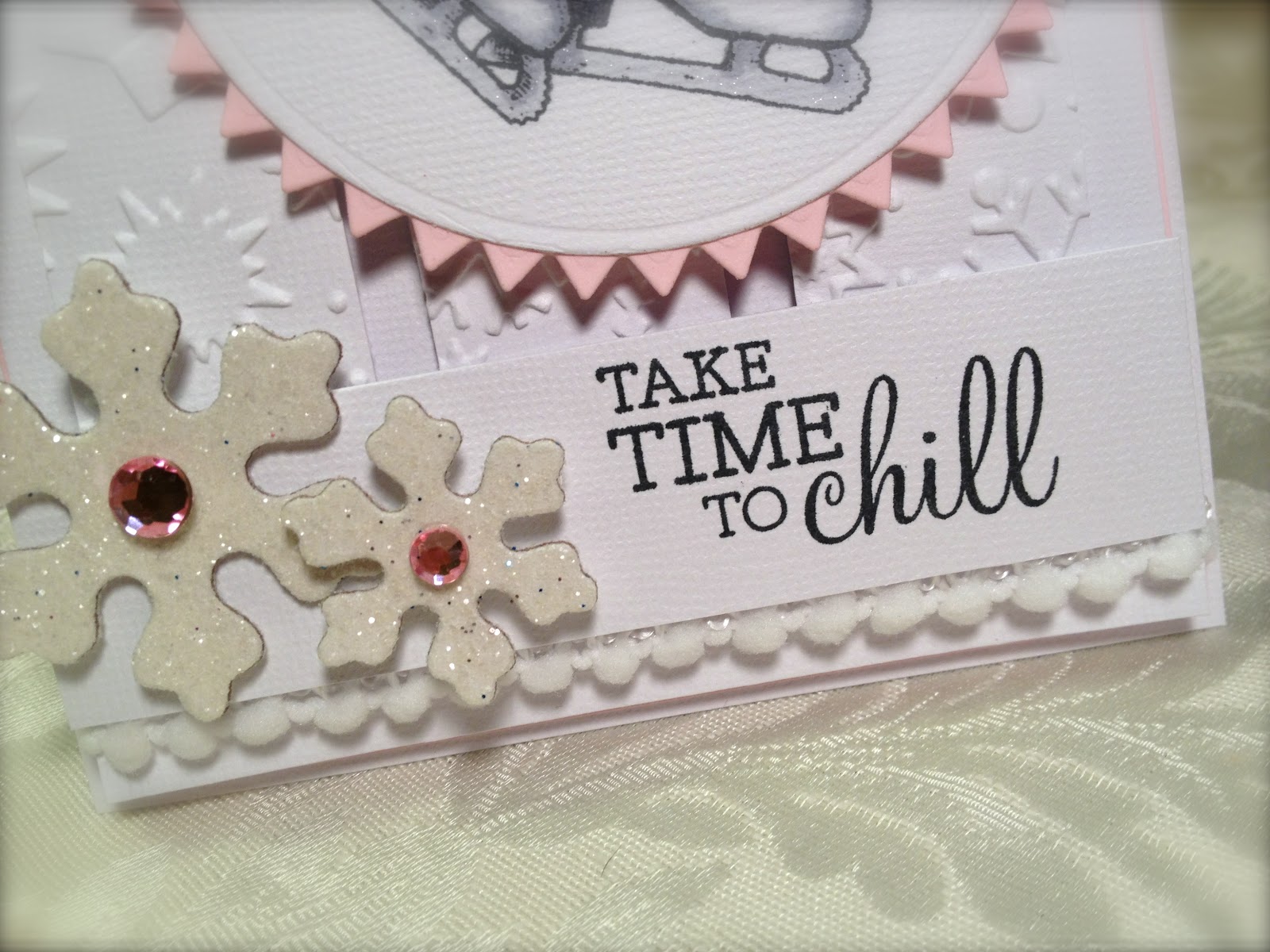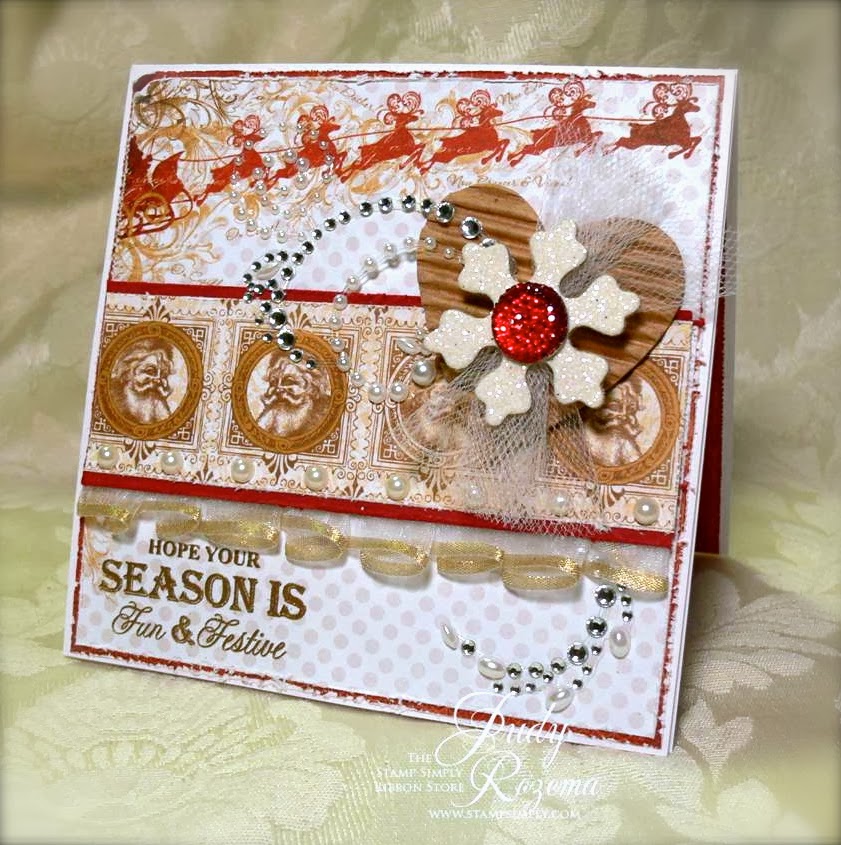 I stamped the background on SU! Crumb Cake using the snowflake stamp and white pigment ink. My chipboard heart has been sitting on my desk for literally a year, waiting to be used! So I thought it would be cute with the sentiment! It was stamped with Versamark Strawberry pigment ink, and then embossed with a glittery red embossing powder. My snow is a glittery ric rac from my stash of oodles of ribbons and trims. I used Zva Dimensionals and 1/4" Scor-Tape to hold everything together. My designer paper is Echo Park's So This Is Christmas 6x6. The total card is 5" square.