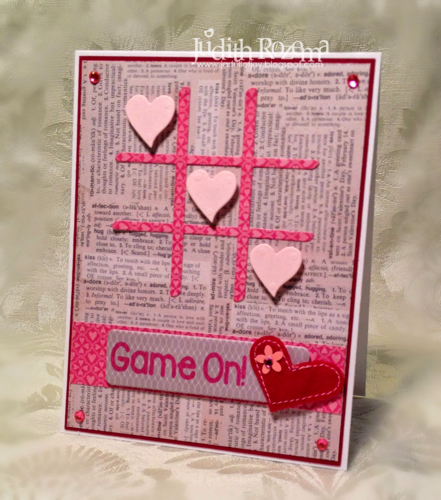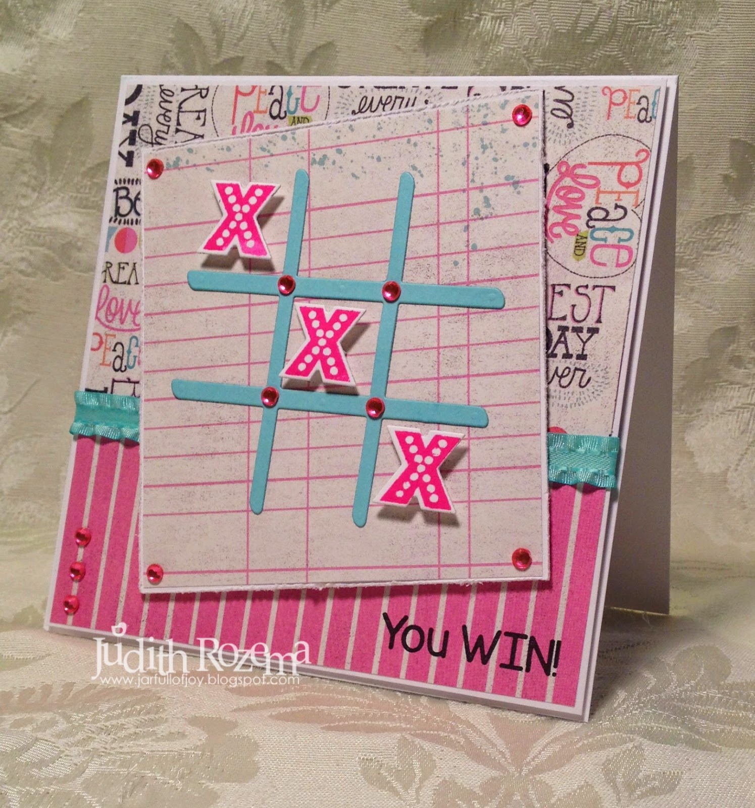 For this card, I embossed the background using a Sizzix embossing folder, and cut the playing grid and X's and O out of white cardstock. I stamped the designs in Strawberry Ink. A little twine and a button and it's ready to send!