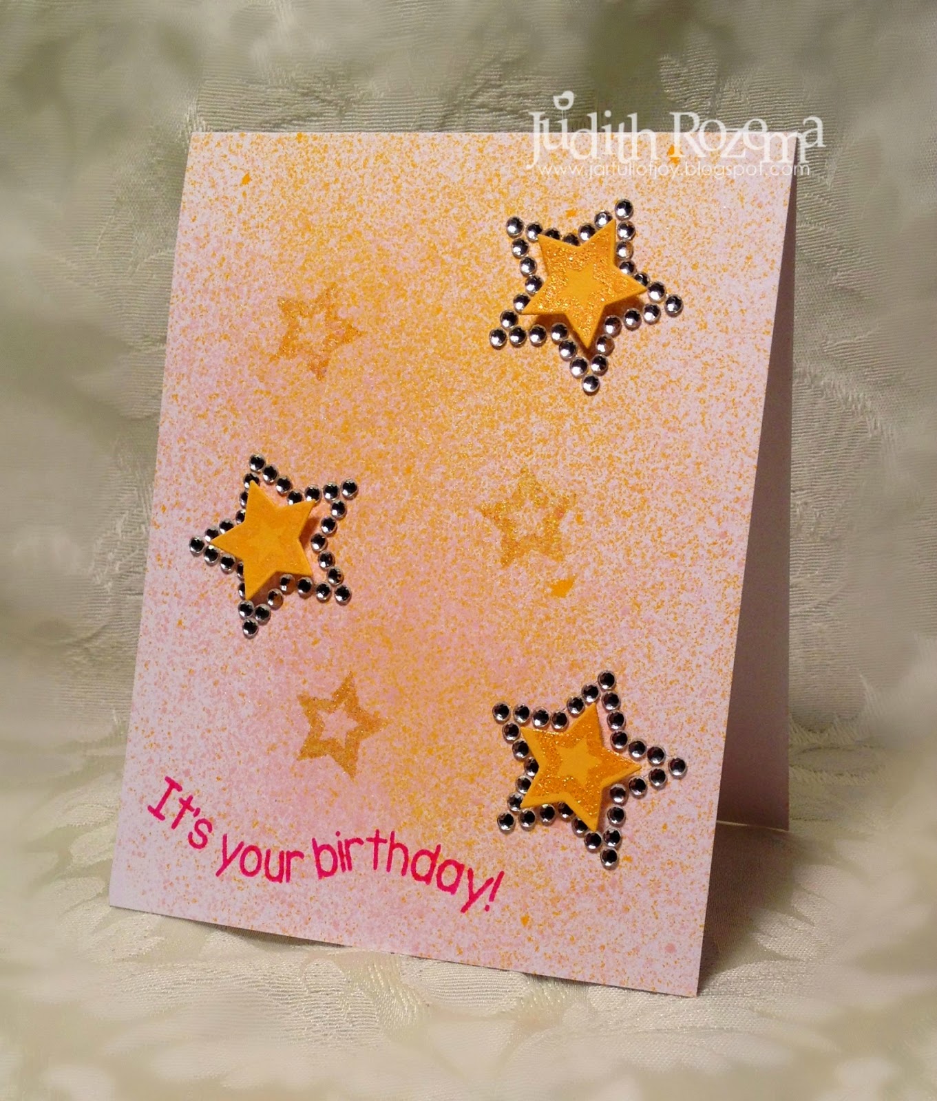 Banana and Strawberry Sprays! made the background for this birthday card. I stamped the stars with watermark ink and then embossed them. The sentiment was curved on the ink block and stamped with Guava ink. I happened to have some rhinestone stars that fit perfectly around the cut out (matching dies!) stars.