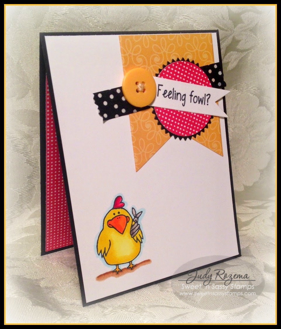 I chose that cute fat little chicken with the sore wing for my card today, and added the matching "Feeling Fowl?" sentiment. I stamped with Memento Tuxedo Black ink and then colored in using Copic markers.