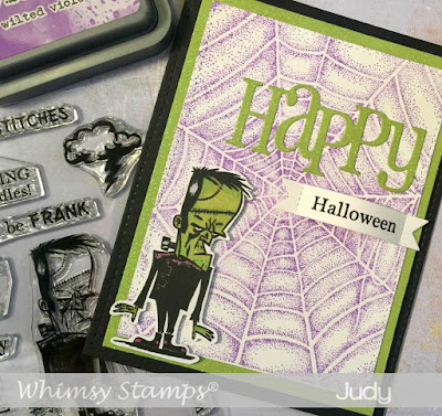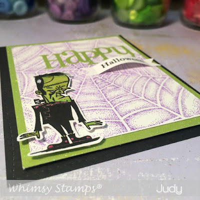 I stamped Frank from the Franken Schmutz set with VersaFine Onyx Black and then colored him using Copic markers. The Bold Banner Die was the perfect size for my sentiment. I used the perforated tabs to bend in in a forward arc so that it stands out.