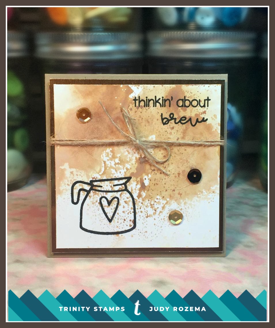 I used the Wrinkle Free Distress technique, and three Distress oxide inks for my coffee background and splatters, and then stamped my images and sentiments with VersaFine Onyx Black ink.