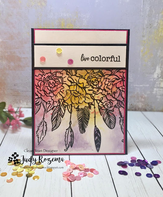 I turned the sketch upside down, so that I had more room on the bottom, and used Wild Heart Gypsy Soul from Picket Fence Studios. I stamped with VersaFine Onyx Black. I scribbled Worn Lipstick and Wild Honey Distress Oxide ink on my craft mat, and then spritzed with water. I lay my Bristol paper stamped with the flowers face down in the ink, and let it take hold for a minute. I dried it with my heat gun, and then repeated two more times, adding some Rose Red ink (SU!) for depth, and Wilted Violet for the feathers.