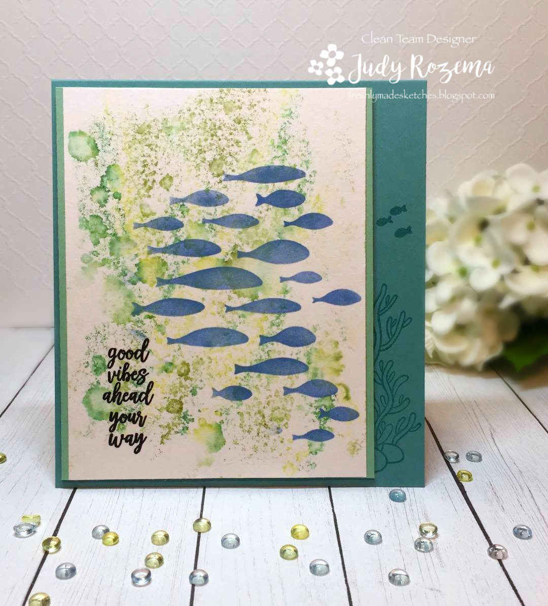 I am using Oceans of Fish Stencil for my main images (all Picket Fence Studios), with a sentiment from Boho Gypsy Girl. My background was made with watercolor paint.
