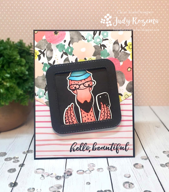 Second is a watercolored background base (Kuretake paints) to match the embossed (Ranger Queen's Gold) aster in the foreground. I cut the beautiful Hello die from glitter cardstock and adhered each to a panel stamped with VersaMark ink. Pearls always add a nice finishing touch!