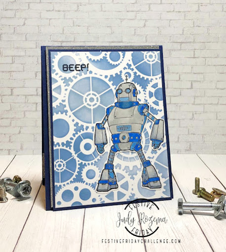 on your project. For my card today, I chose navy, stencil, robot/gears, and glitter.